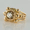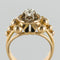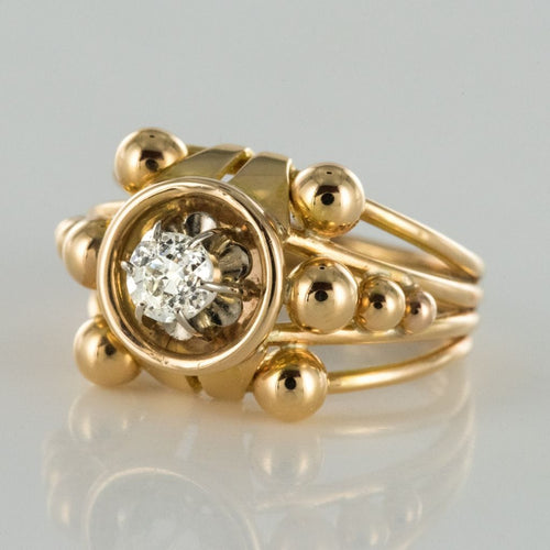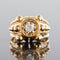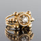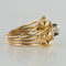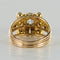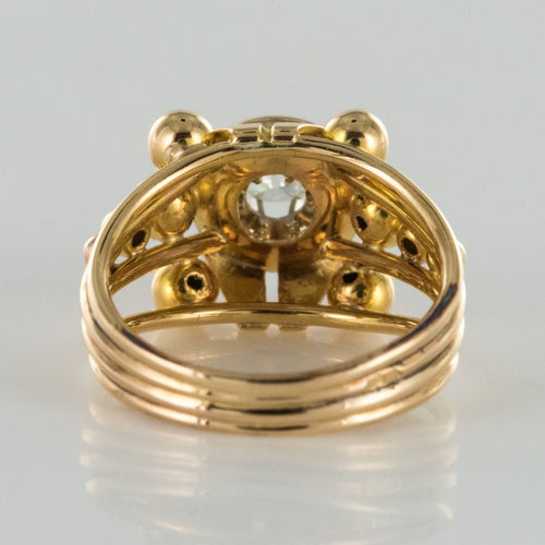 Yellow gold ring, 750/1000th, 18 carats, eagle's head hallmark. Openworked, it is set in the center with 6 claws with a brilliant-cut diamond. On either side, 2 x 5 gold pearls are set. The ring is made up of 4 gold wires which join at the base and at the central plate.