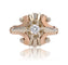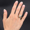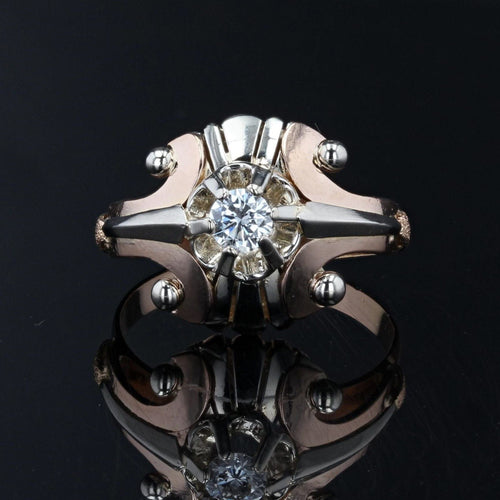 - Domed, this old ring is adorned with a brilliant-cut diamond. On either side, on the edge and at the start of the ring, an arrow pattern which separates two volutes is finished with white gold pearls giving the impression of a fleur-de-lis.