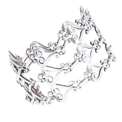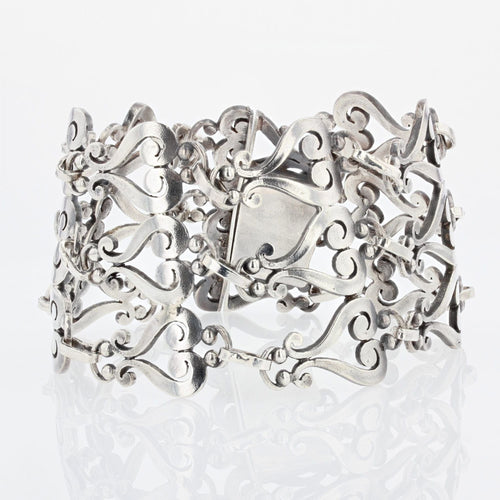 - Large curb bracelet, it is made up of three openwork rows of scroll patterns held by rings articulated between them. The hook is a large ratchet.