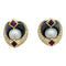 A pair of earrings branded Marina B. in 750/000 yellow gold. Each pair is centered with a round white cultured pearl, enhanced with hematite, calibrated rubies and a pavé of brilliant-cut diamonds.
