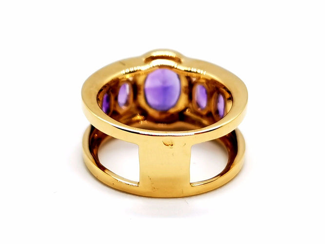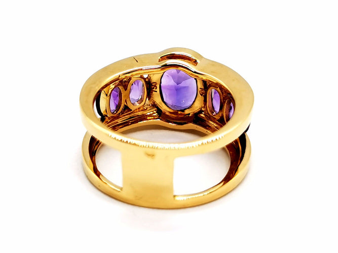 Ring in 750 thousandths (18 carat) yellow gold, set with a central oval amethyst of approximately 1 carat, and 4 other oval amethysts of approximately 0.34 ct each, total amethyst weight: approximately 2.36 carats, size: 52, width on top: 1.09 cm, total weight: 8.09 g, eagle's head hallmark, excellent condition