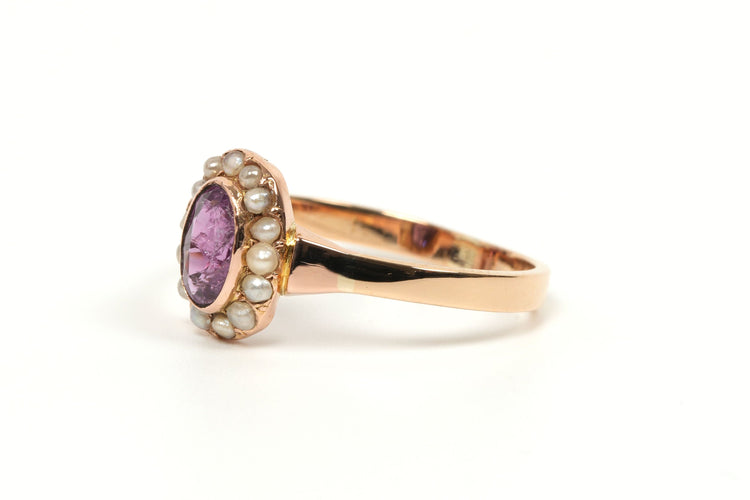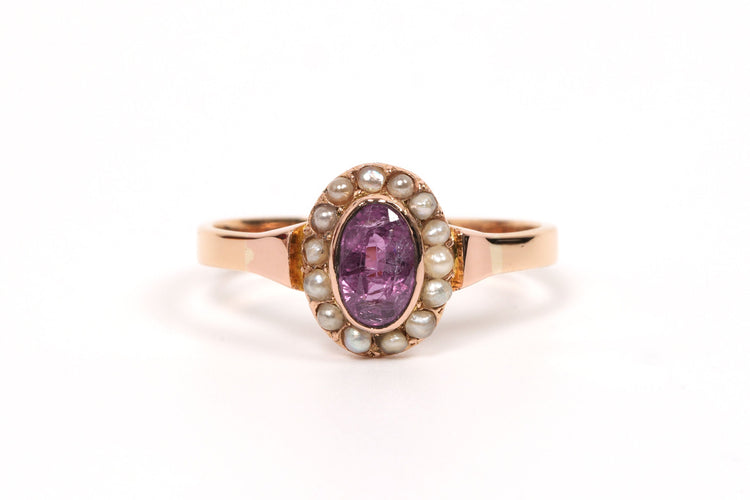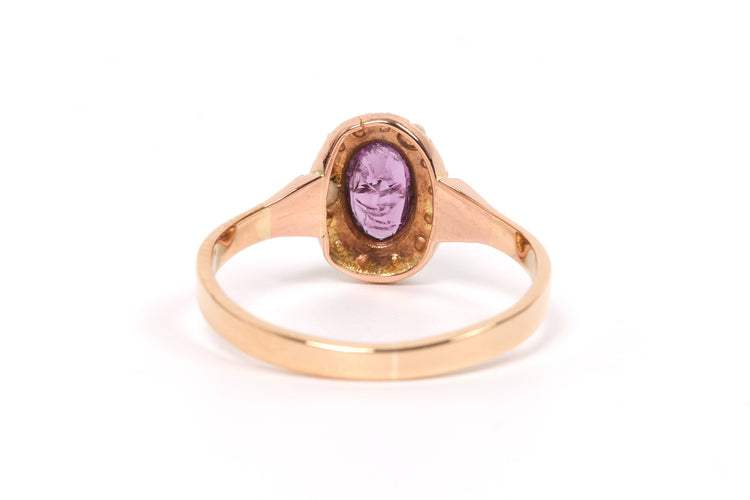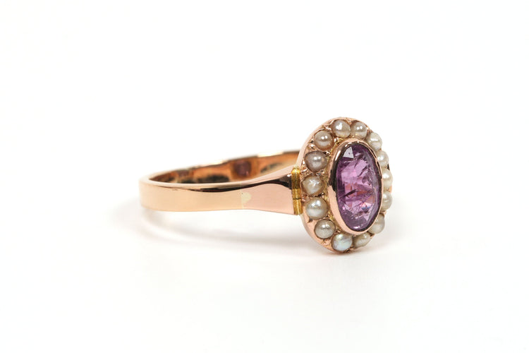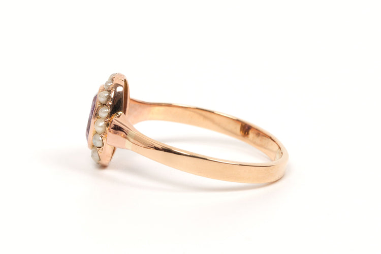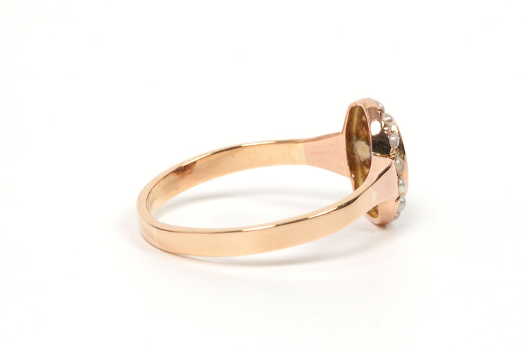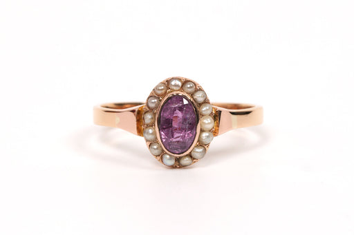 Napoleon III ring in yellow gold set with a garnet and pearls