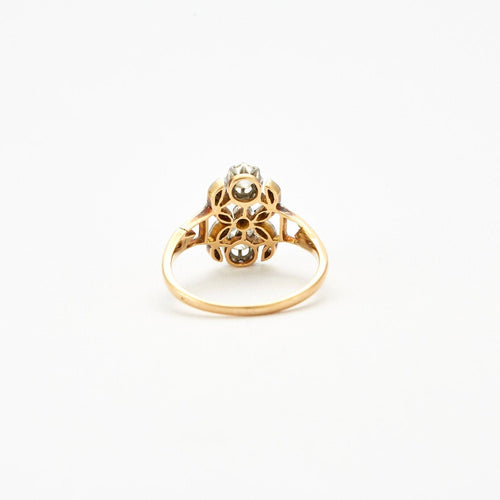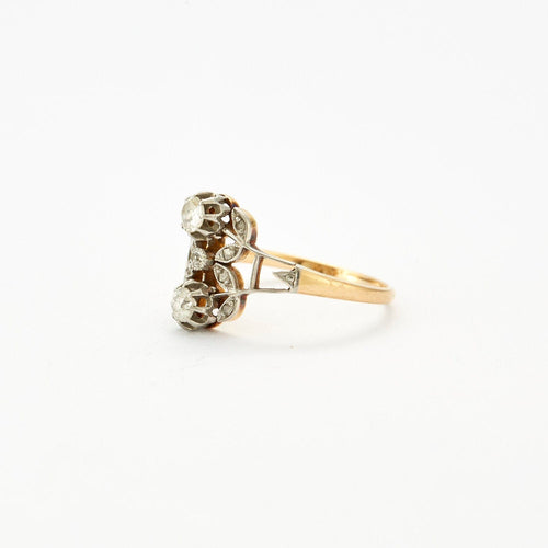 Openwork 18K (750 thousandths) yellow and white gold ring with foliage motif centered on two old-cut diamonds weighing approximately 0.15 carat each, bordered by small rose-cut diamonds.
