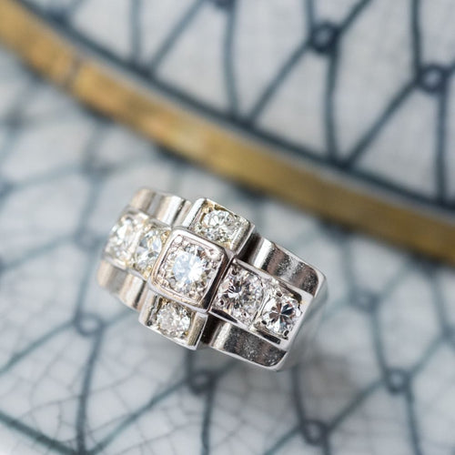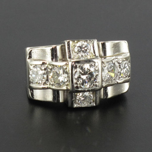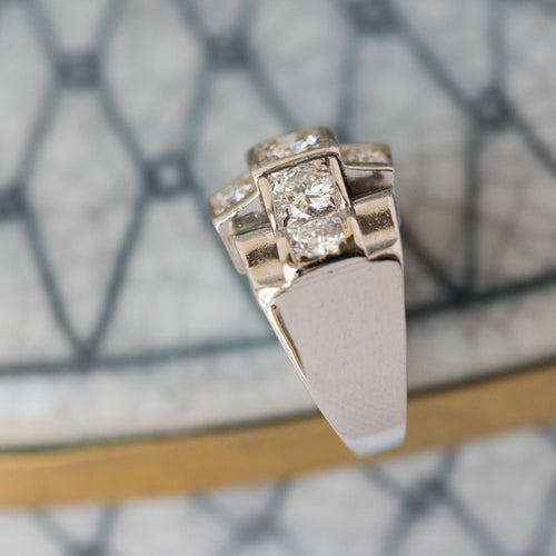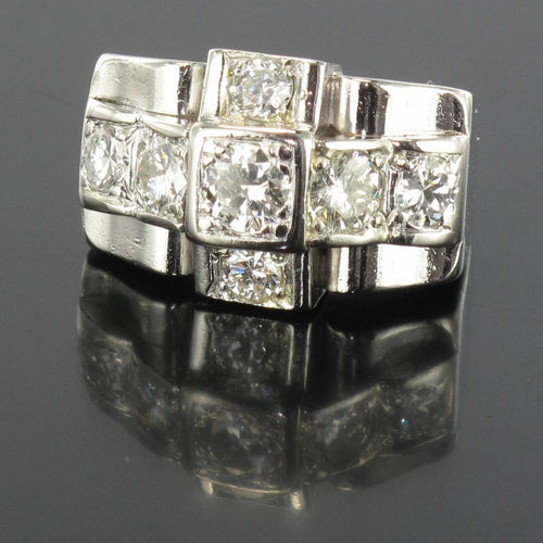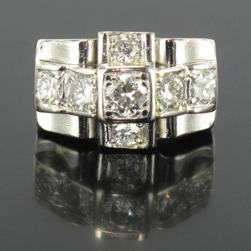 Ring in platinum. This splendid ring Art Deco presents the geometric lines of its time. This antique diamond ring is set with 7 modern and intermediate brilliant-cut diamonds, the center one being larger.