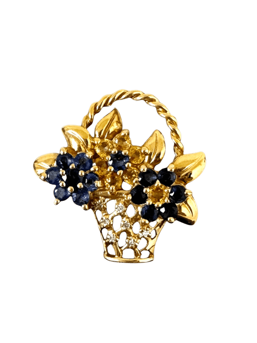 Charming “Panier Fleuri” brooch in 18-carat (750 thousandths) yellow gold, adorned with sparkling diamonds and deep blue sapphires. Weighing 6.0g, this delicate and refined jewel evokes the grace and beauty of a floral bouquet. A unique and elegant piece ideal to complete a distinguished style.