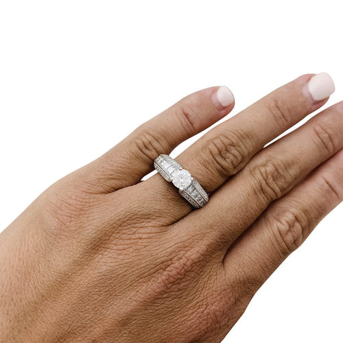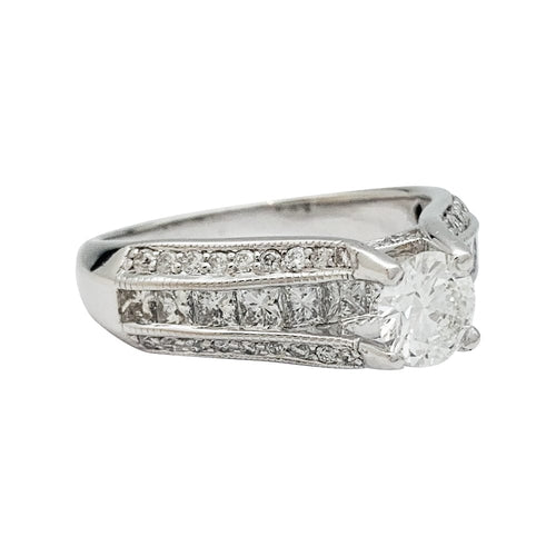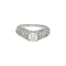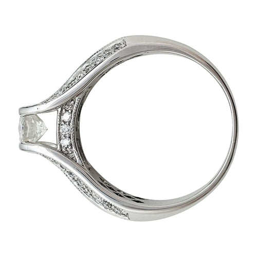 A 750/000 white gold ring centered on a brilliant-cut diamond of 0.70 carat, color G and purity SI 2 raised by four prongs, supported by lines of princess-cut and brilliant-cut diamonds.