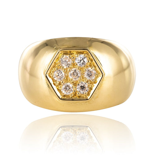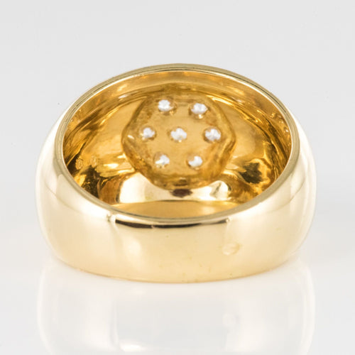 Yellow gold ring, 750 thousandths, 18 carats. This voluminous bangle ring is domed and set in a diamond-shaped setting with 7 brilliant-cut diamonds.