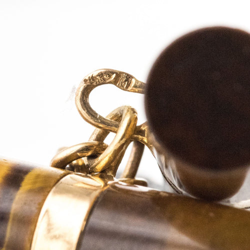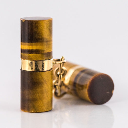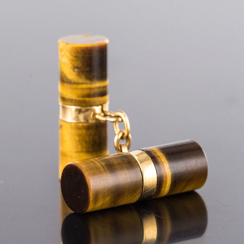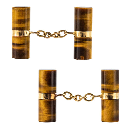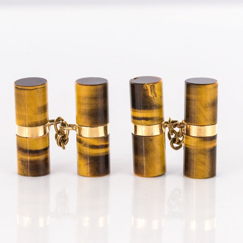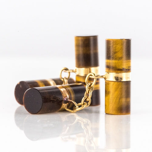 Pair of cufflinks in yellow gold, 750 thousandths, 18 carats, eagle's head hallmark. Each old cufflink is set with two long tiger's eye cylinders connected by a flexible chain.