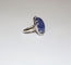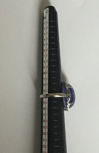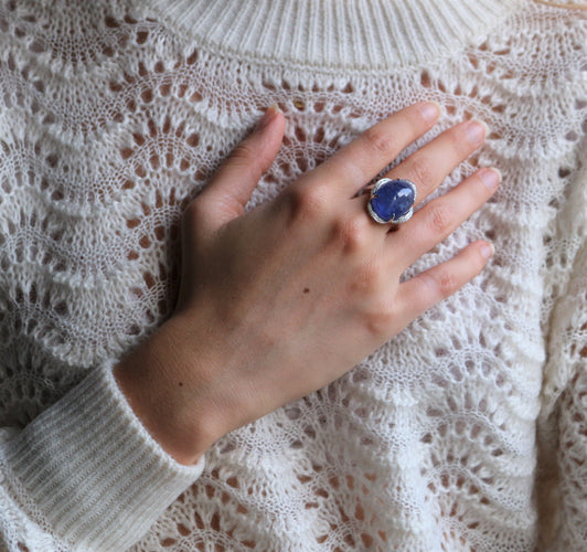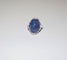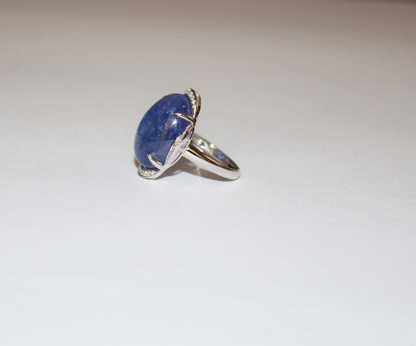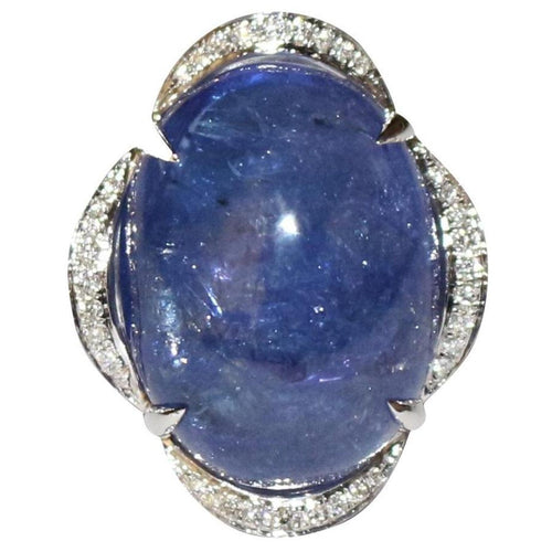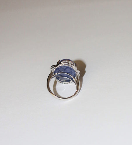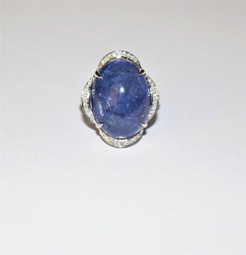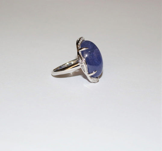 Ring in 750 white gold adorned with a cabochon tanzanite measuring approximately 19mm/14mm/9mm and a brilliant diamond surround, goldsmith's hallmarks (French manufacture) and eagle's head on the outer ring.