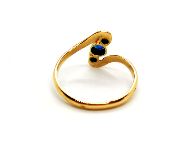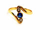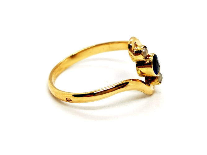 Pearl and sapphire ring, in tested 750 thousandths (18 carat) yellow gold, set with a blue sapphire of approximately 0.15 ct, and two cultured pearls, 2 mm in diameter, Ring size: 50, width on top: 1.16 cm, total weight: 1.76 g, excellent condition