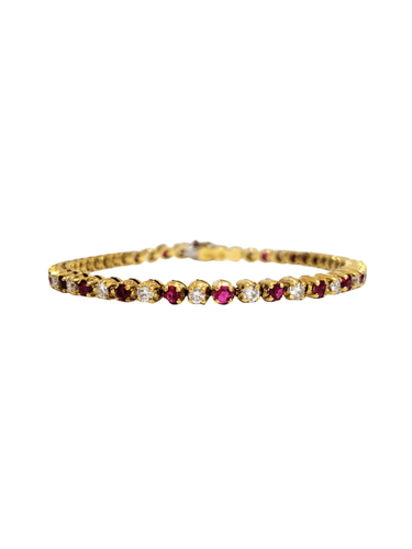 Pretty river bracelet in yellow gold composed of 24 rubies (approximately 1.40ct) and 24 diamonds (approximately 1.50ct) claw-set.