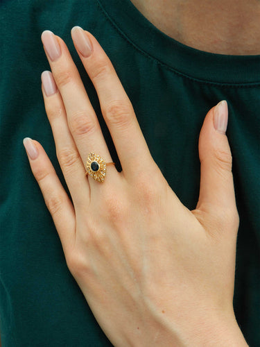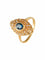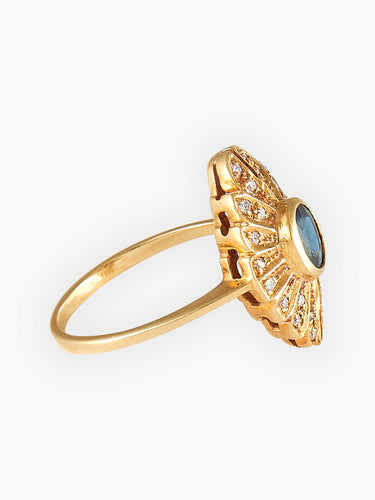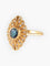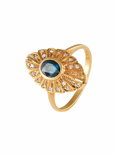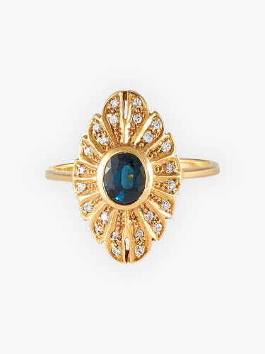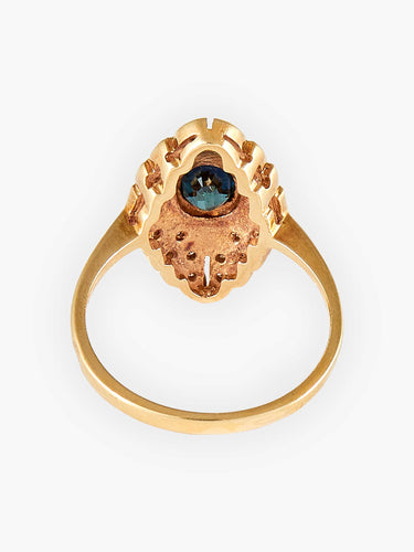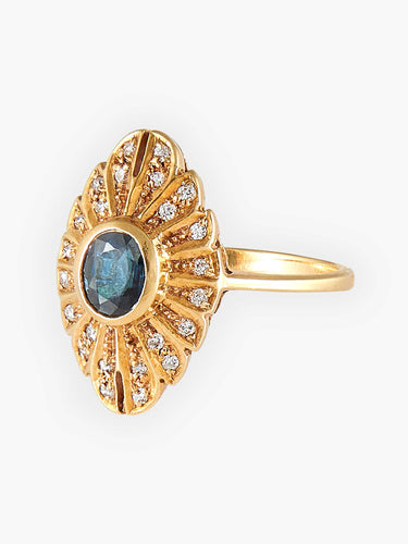 Marquise ring in yellow gold adorned with a sapphire surrounded by diamonds.