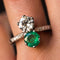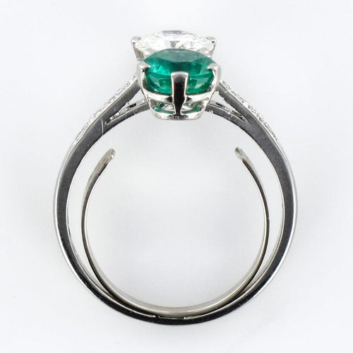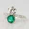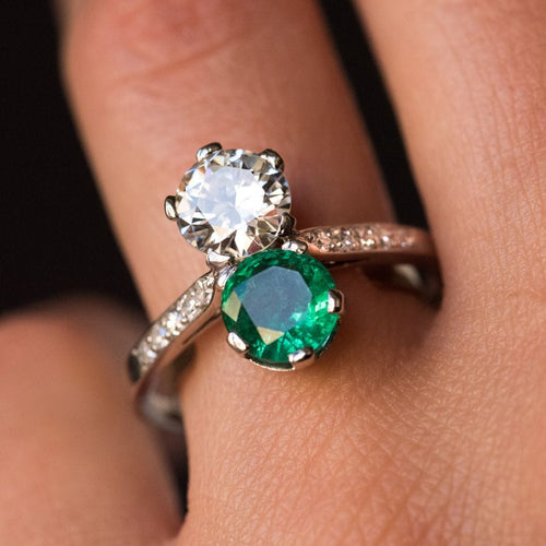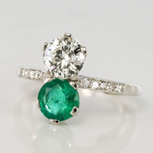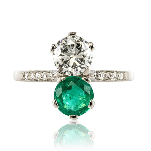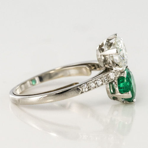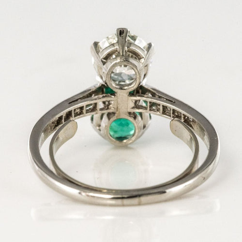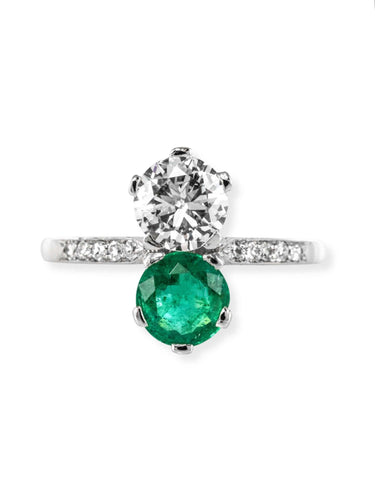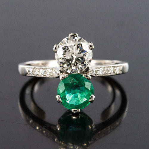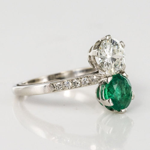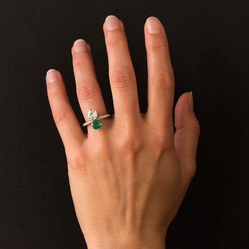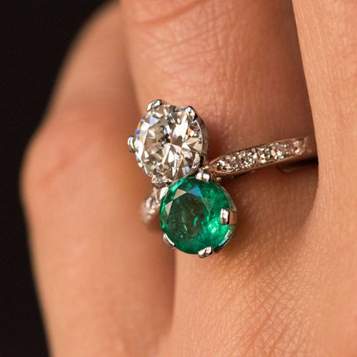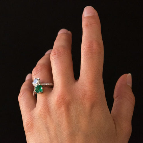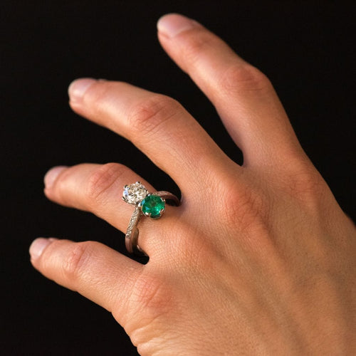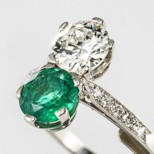 Ring in platinum, dog head hallmark. Called Toi & Moi, this ring is set with a brilliant-cut diamond and a round emerald. On either side, at the start of the ring, a line of 8/8 cut diamonds is set.