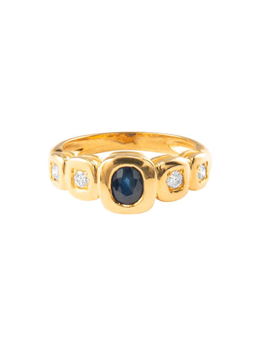 Yellow gold ring, a central sapphire and two diamonds on either side are beautifully set.