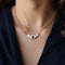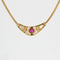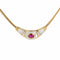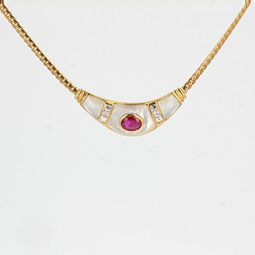 - This yellow gold necklace second-hand is made of a flat curb chain link which retains a mother-of-pearl crescent pattern on the front. A ruby is bezel-set in the center of this motif. 2 x 3 princess cut diamonds are distributed on each side of the central ruby.