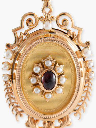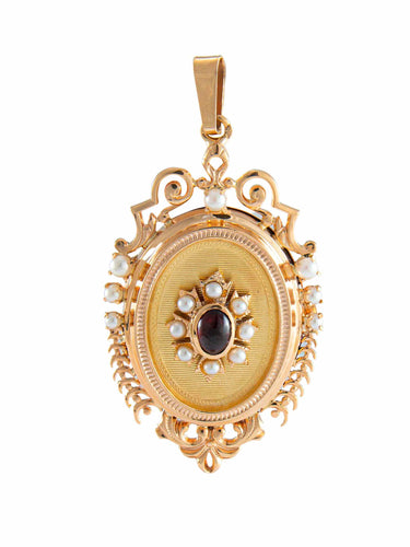 Vintage pendant in 18-carat 750‰ yellow gold, decorated with a cabochon-cut garnet and fine pearls. It opens using a small hinge on the side.