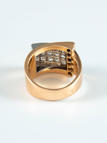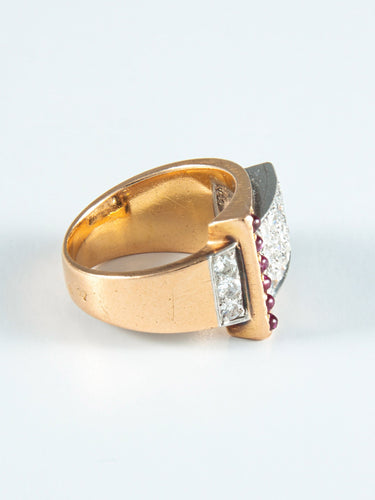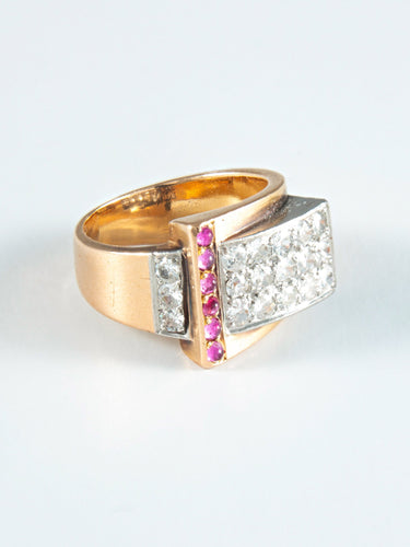 750/1000th yellow gold ring adorned with a pavé of diamonds, enhanced with a line of rubies.