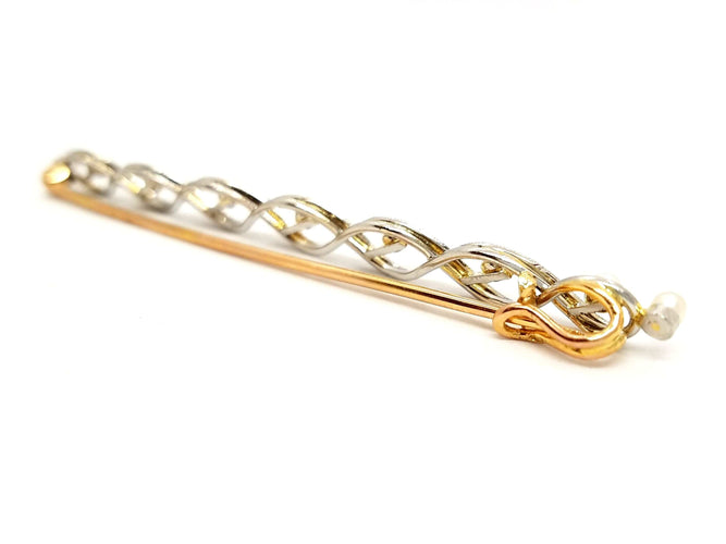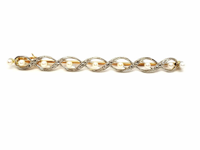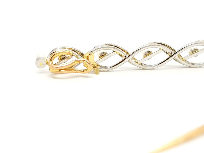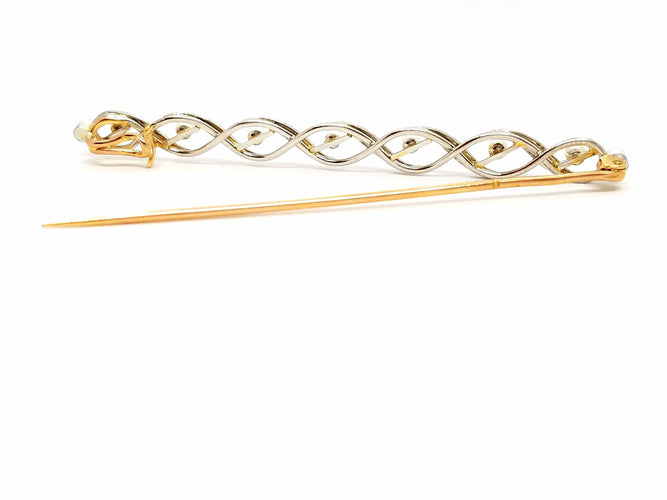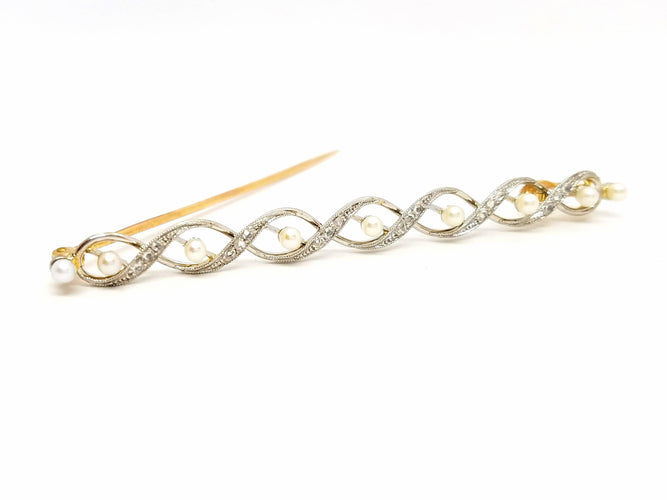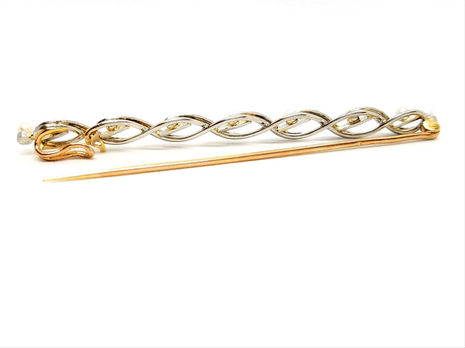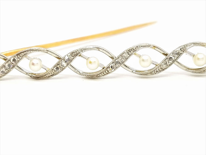 Pin Art Deco two-tone in 750 thousandths (18 carat) pink gold, and set in white gold, 9 cultured pearls of 2.5 mm in diameter, and 18 old-cut H SI diamonds for approximately 0.14 ct in total, pin in pink gold 750 thousandths (18 carats), length: 7.57 cm, width: 0.65 cm, eagle's head hallmark, total weight: 6.91 g, Excellent condition
