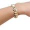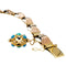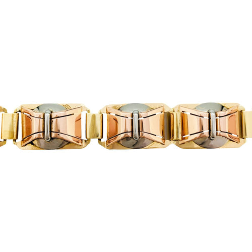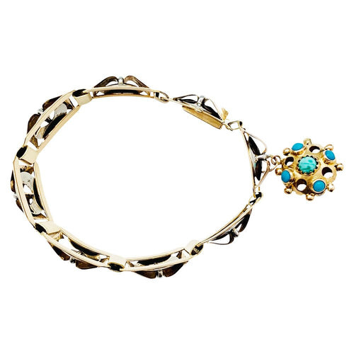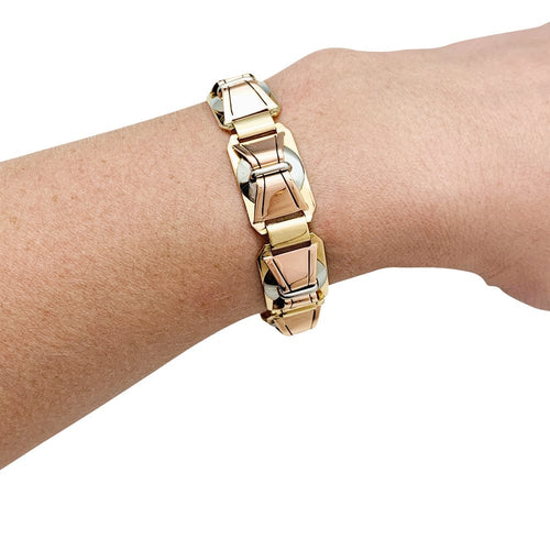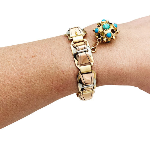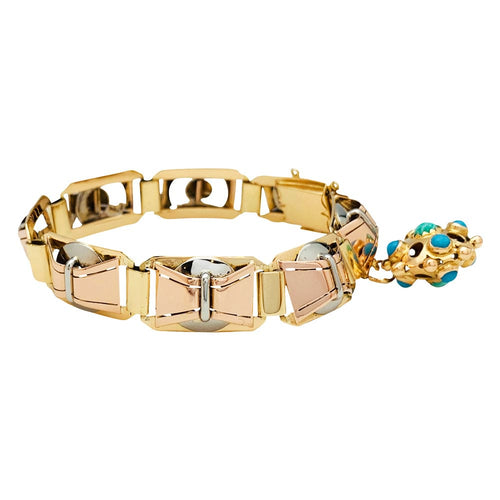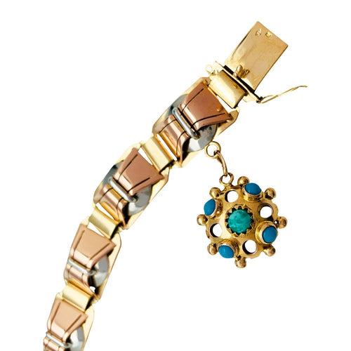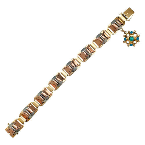 A stylish bracelet Tank, in three colors of 750/000 gold, formed of 8 links, holding a 750/000 yellow gold charm set with imitations of amazonites and turquoise.