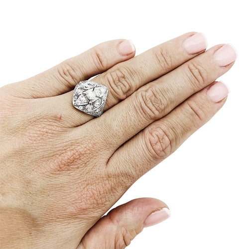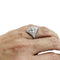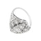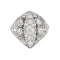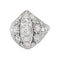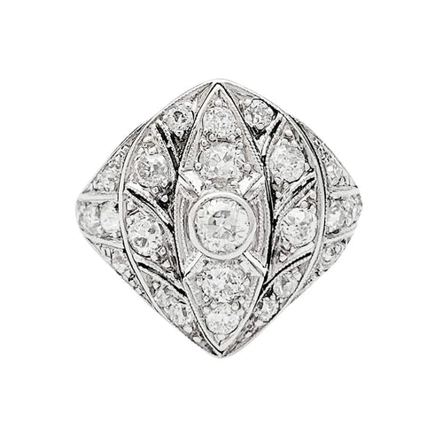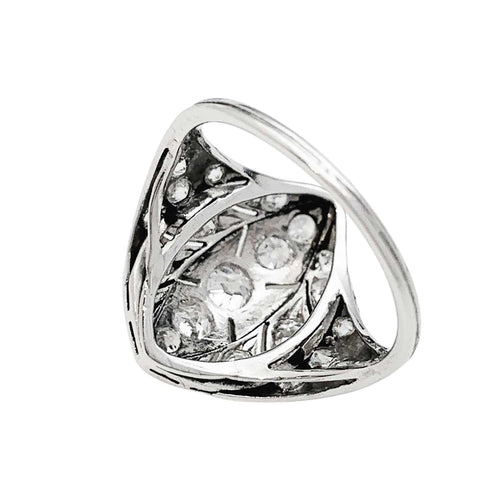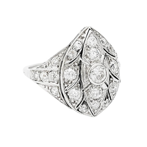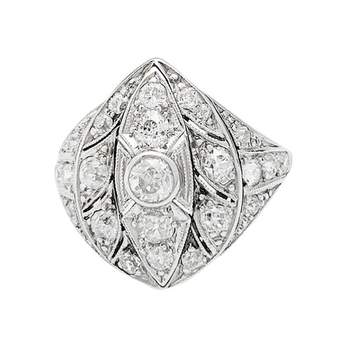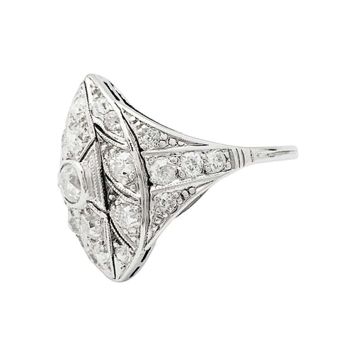 An old shuttle-shaped ring in 750/000 white gold set with old-cut diamonds, pearl setting.