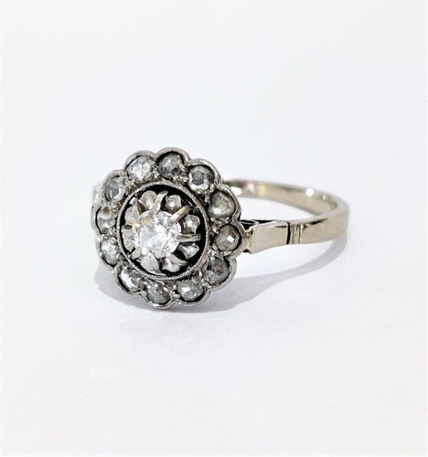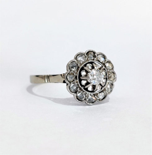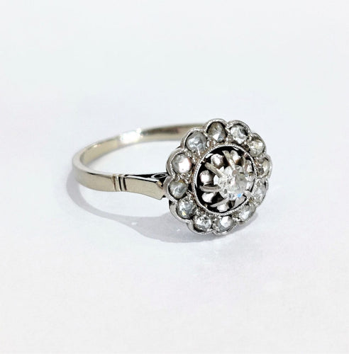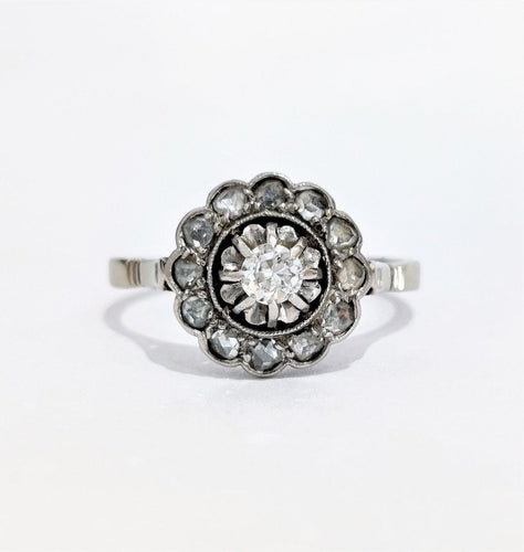 Ring Daisy in white gold and platinum circa 1925 set with a half-cut diamond weighing approximately 0.15 carat in an entourage of rose-cut diamonds.
