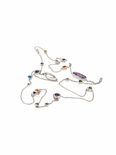 Magnificent long necklace, 18 carat white gold, hallmarked, Total weight: 25 g, set with multiple fine stones: oval amethyst (20 mm x 8 mm), aquamarine diamond (20 mm x 8 mm), orange sapphire, green sapphire, oval tsavorite, yellow sapphire. Can be put in several shapes, short or long, one or two turns, Size: 95 cm, New condition, New price: 12,000 euros