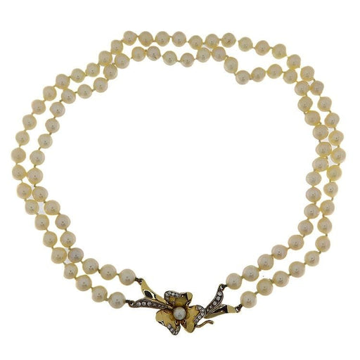 Collana 2 fili Akoya pearl, giapponesi color crema, d'acqua salata con chiusura in oro giallo e bianco 18 kt e diamanti taglio Brilliant e Eight-eight