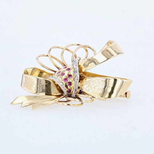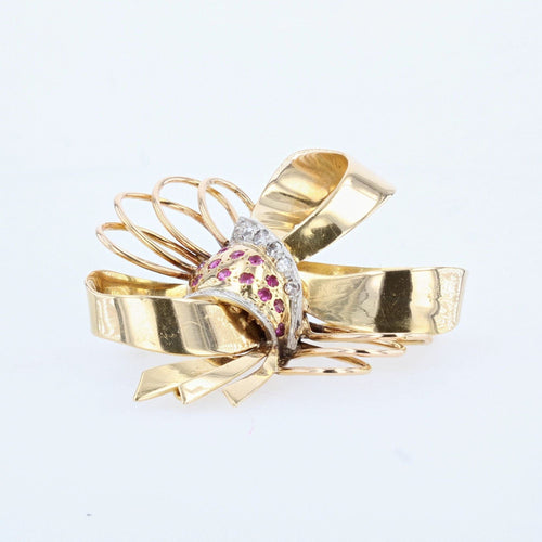 - Splendid vintage brooch, it forms an openwork knot with gold threads. The center has original synthetic rubies in paving, supported on either side by lines of diamonds. The hook is a pin with safety pump.