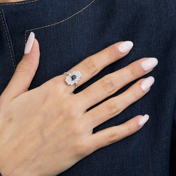 Ring Art Deco in platinum (950 thousandths) composed of a geometric pattern decorated in its center with a faceted oval sapphire calibrating approximately 0.50 carat in a closed setting, supported by two round brilliant-cut diamonds calibrating a total weight of approximately 0.15 carat; the rest of the pattern and the beginning of the ring is paved with small round brilliant-cut diamonds calibrating a total of approximately 0.70 carat.