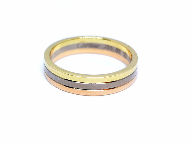 Ring branded of the House Cartier, wedding ring collection Trinity, in 750 thousandths (18 carat) yellow, white and pink gold, Size: 62, width: 4.8 mm, total weight: 7.60 g, branded and numbered: XE8172, hallmarked, excellent condition, new price: 1850 euros