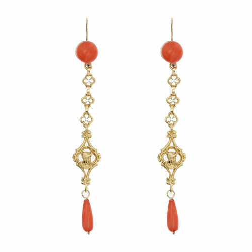 - Each antique earring is composed of a coral cabochon that supports gothic motifs with a knight's head. At the tassel base, a drop of coral completes the ancient jewel.