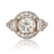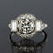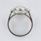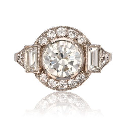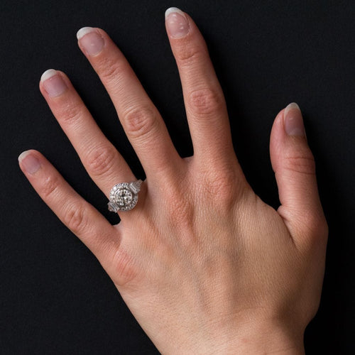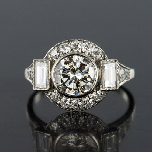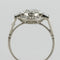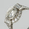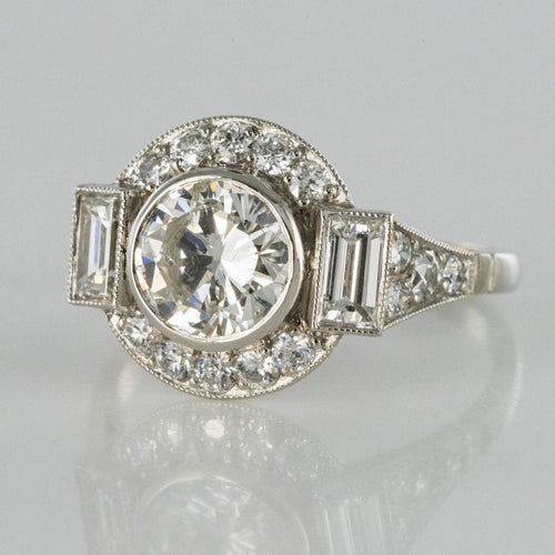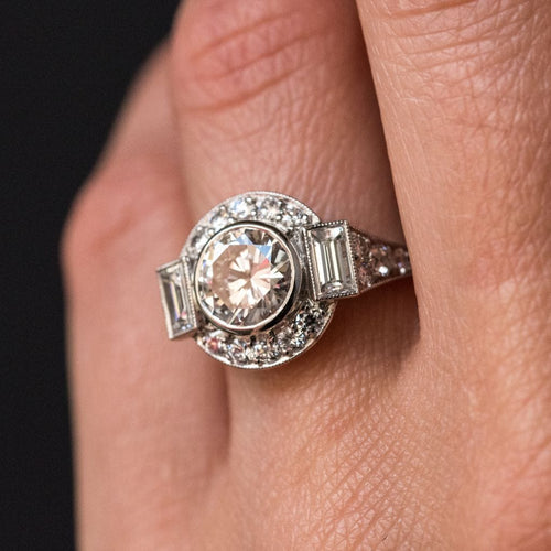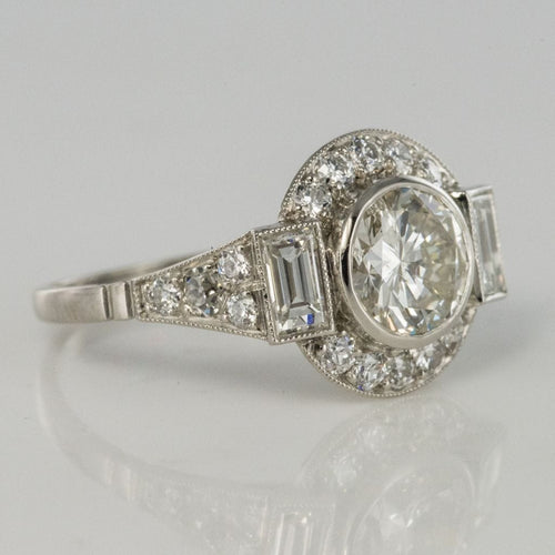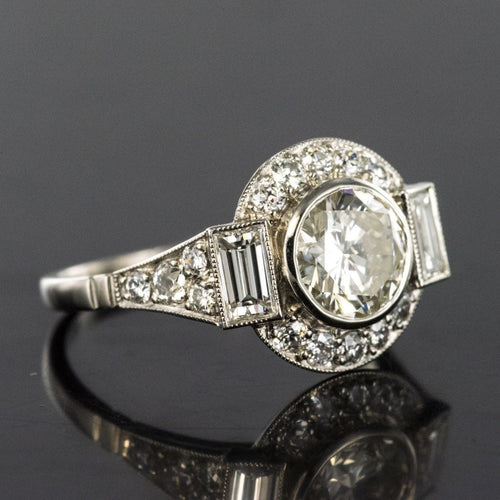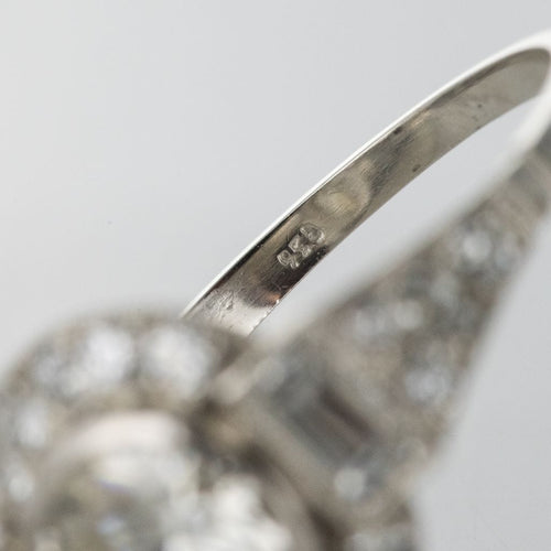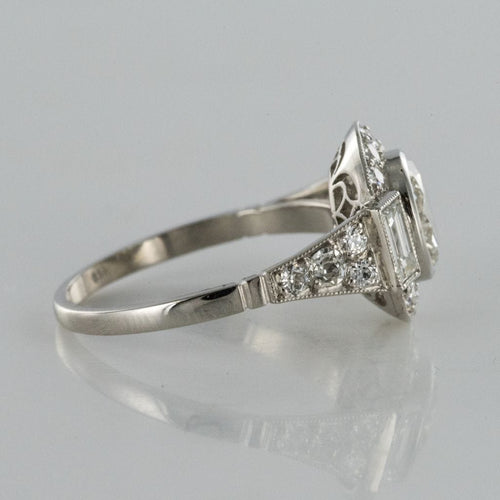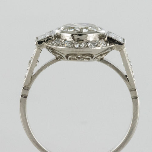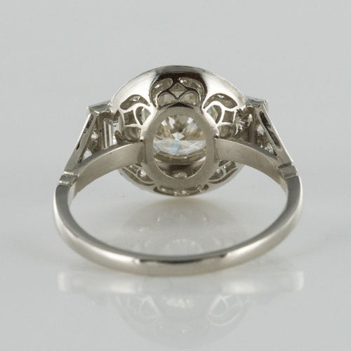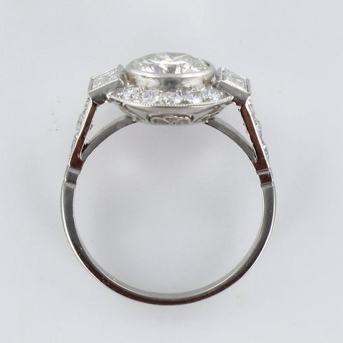 Ring in platinum. Splendid stylish ring Art Deco round in shape, it is bezel set in the center with a brilliant-cut diamond supported on either side by 2 baguette-cut diamonds in a milgrain setting and 2 x 5 brilliant-cut diamonds on the curves. On either side of the head at the start of the ring are set with 4 brilliant-cut diamonds. The basket of vaulted decorations.