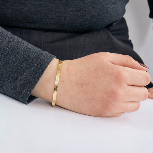 Cartier- Love Small model - Opening bangle bracelet with hinges in 18K (750 thousandths) yellow gold chiseled with a decoration of stylized screws, six of which are adorned with small brilliant-cut diamonds.