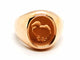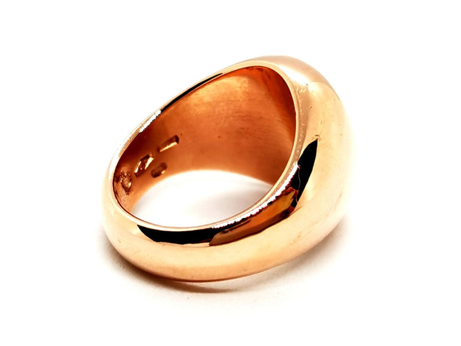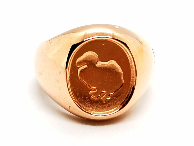 Signet ring, branded from the Dodo house Pomellato, in 385 thousandths (9 carat) pink gold, on top an oval tray enhanced with an engraved Dodo motif, Ring size: 48, width on top: 1.43 cm, total weight: 12.19 g, cloverleaf hallmark, excellent condition.
