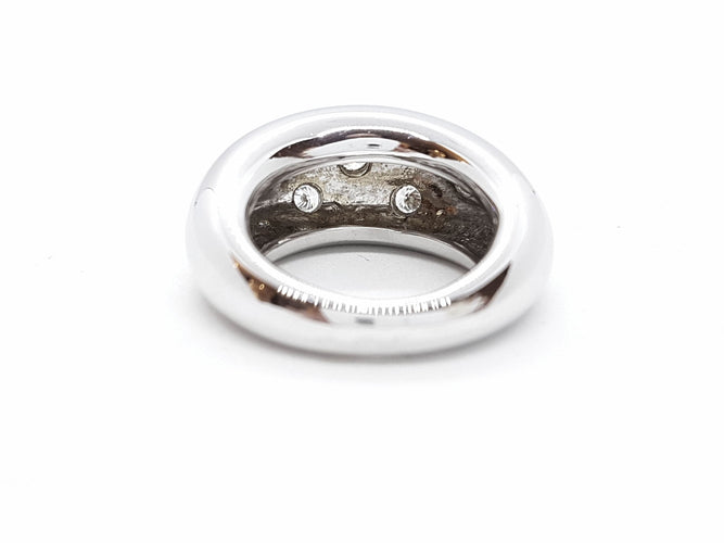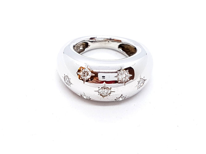 Ring in 750 thousandths (18 carat) white gold, band paved with 7 G-VS brilliant-cut diamonds in star setting for a total of approximately 0.42 ct, a diamond of approximately 0.12 ct and 6 diamonds of approximately 0.05 ct each, total weight: 19.24 g, Ring size: 52, width on top: 1.15 cm, height of the ring: 0.8 cm, hallmarked, excellent condition