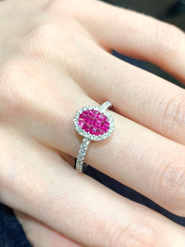 750 white gold ring composed of 12 calibrated rubies forming an oval surrounded by diamonds.