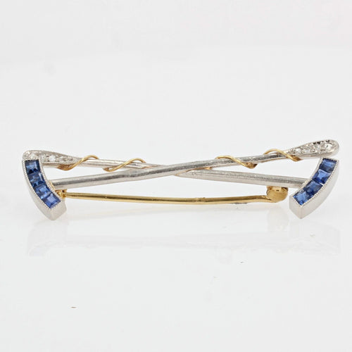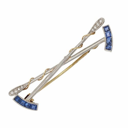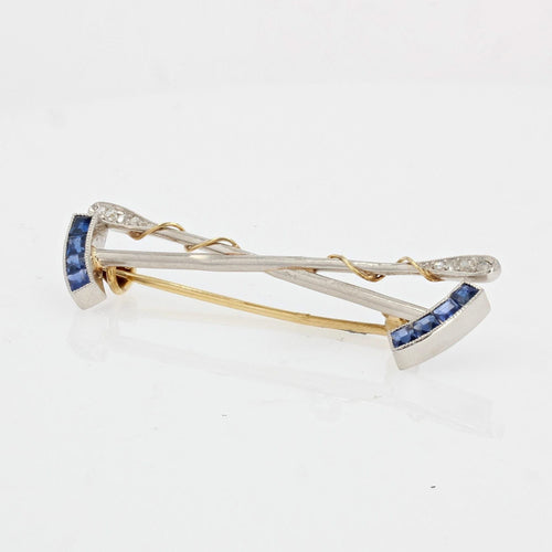 - This lovely brooch Art Deco represents two polo mallets, one end of which is set with calibrated sapphires and the handle with rose-cut diamonds. The hanging system is a pin with safety cone.