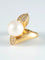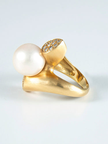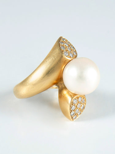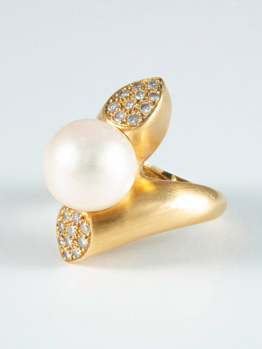 Important ring in 750/1000th yellow gold adorned with a pearl and two diamond-paved leaves.