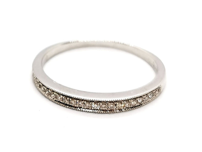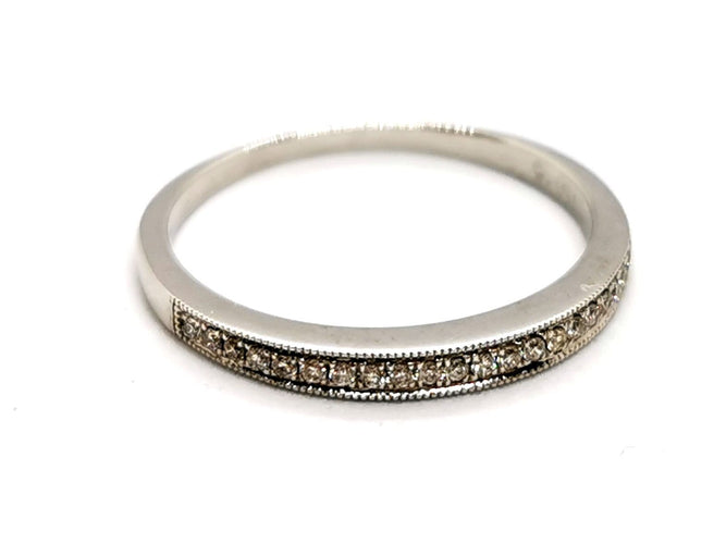 Half diamond wedding ring, in tested 750 thousandths (18 carat) white gold, set with 22 diamonds, brilliant cut, approximately H/VS, for a total of approximately 0.11 ct, Ring size: 56, width on top: 0.23 cm, total weight: 2.15 g, new condition