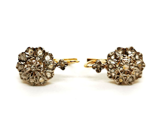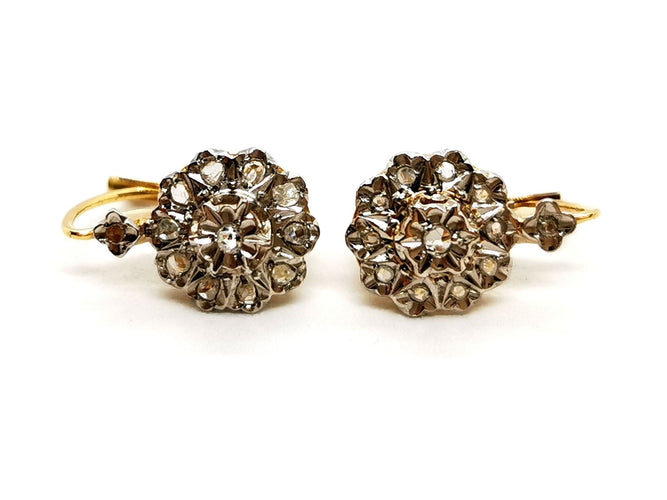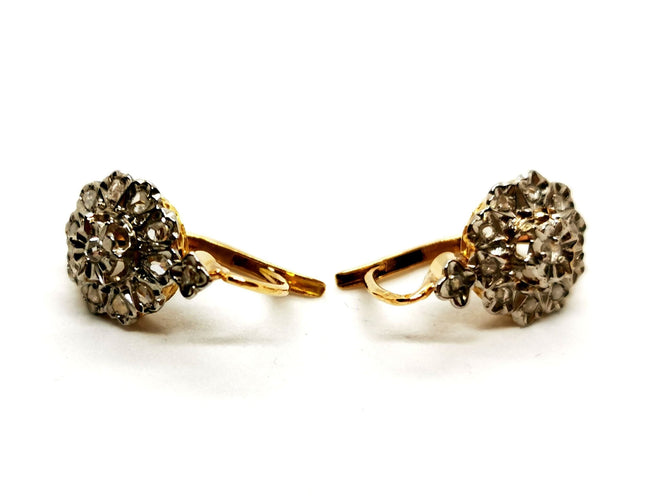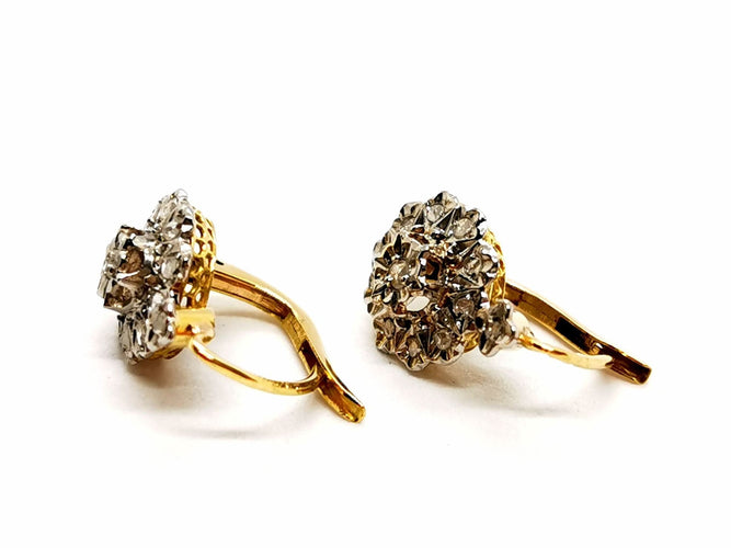 Diamond sleeper earrings, style Art Deco, in tested 750 thousandths (18 carat) yellow and white gold, set with 24 diamonds, old cut, approximately H/VS, approximately 0.015 ct each, total diamond weight: approximately 0.36 ct, dimensions: 1.51 cm X 0.98 cm, total weight: 2.58 g, excellent condition.