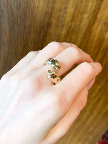 Threaded ring in three-color 18k (750) gold, with two chiseled cougar heads, branded of the House Cartier.