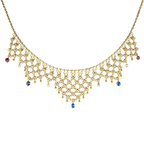 Antique gold drapery necklace with sapphires, rubies and pearls