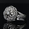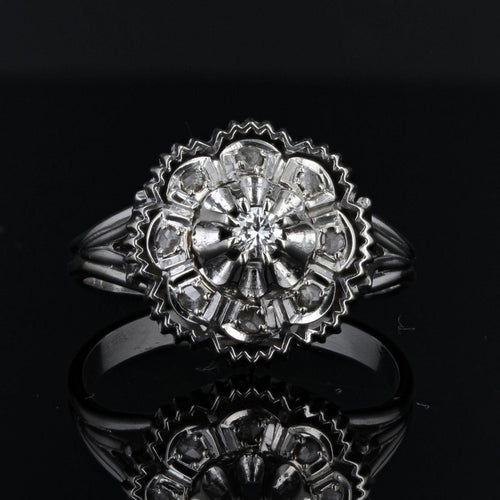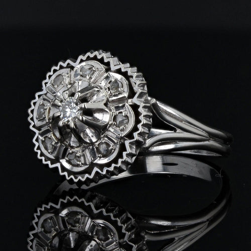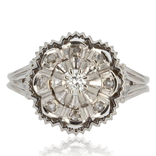 - Round polylobed and serrated, this vintage ring is set on top with a brilliant-cut diamond surrounded by rose-cut diamonds.