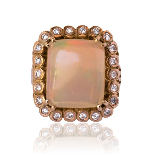 Ring in pink gold, 750/1000th, 18 carats. It is set with double claws on its top with a rectangular cabochon opal supported by 22 brilliant-cut diamonds in a bezel setting. The basket is openwork and the start of the ring is made up of 4 gold wires which then join together.