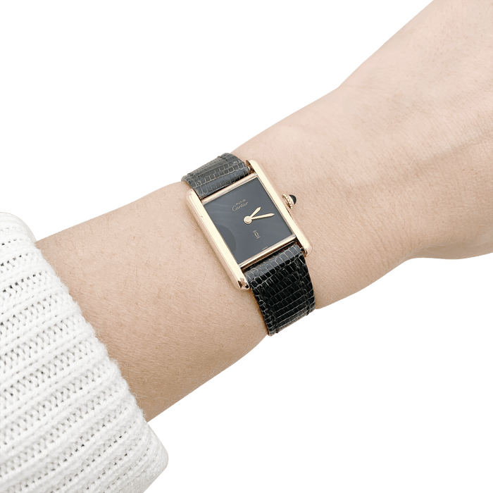 Watch Cartier "Tank Must" silver gold plated, black lacquered dial.