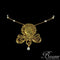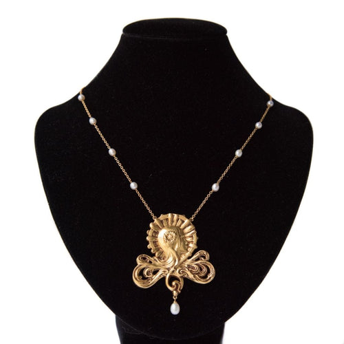 Necklace in yellow gold, 750/1000th, 18 carats, eagle's head hallmark. The motif is a woman's face in profile, a flower in her undone hair, all on an openwork plant decoration. A pear cultured pearl hangs from the tassel base. The chain is a round cable mesh dotted on either side with 2 x 4 white oriental cultured pearls. The clasp is a spring ring.