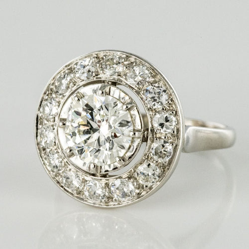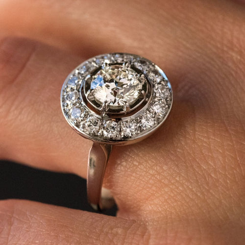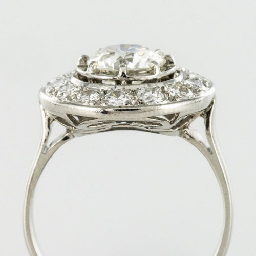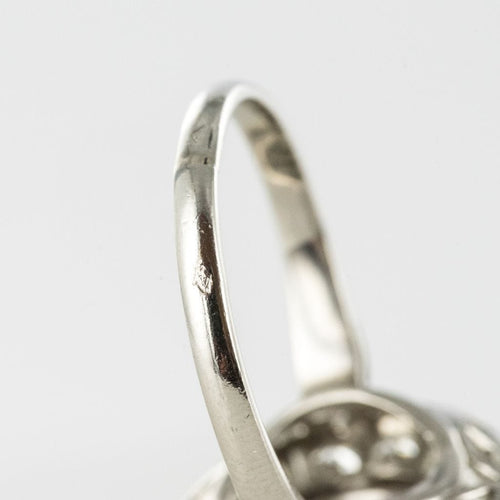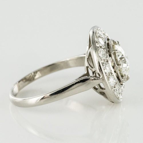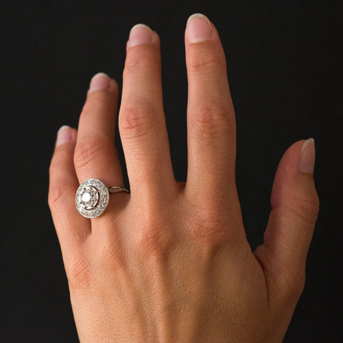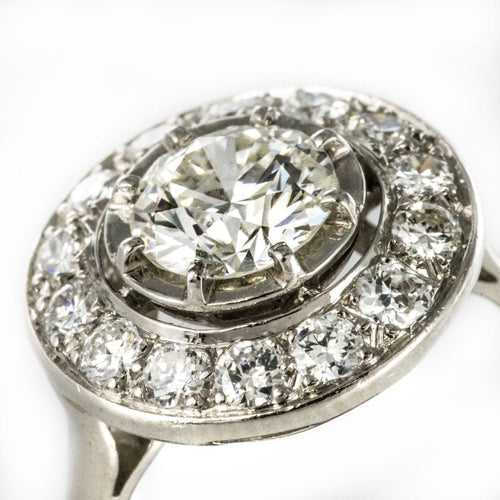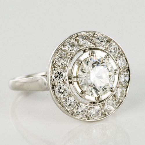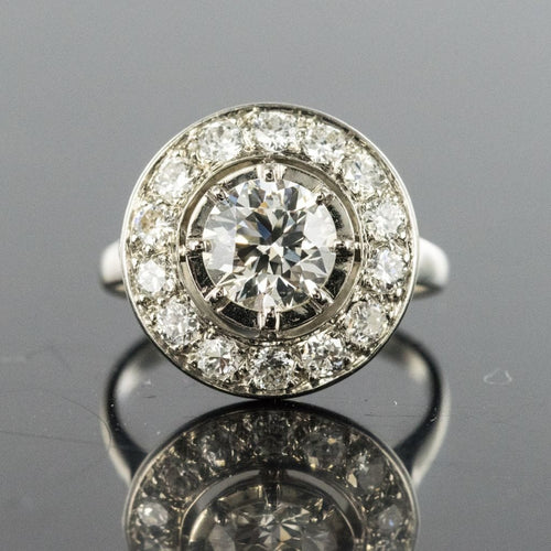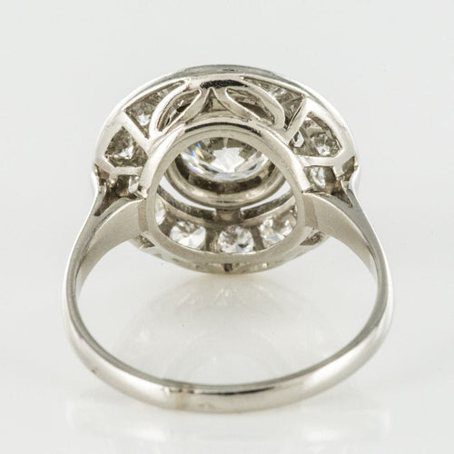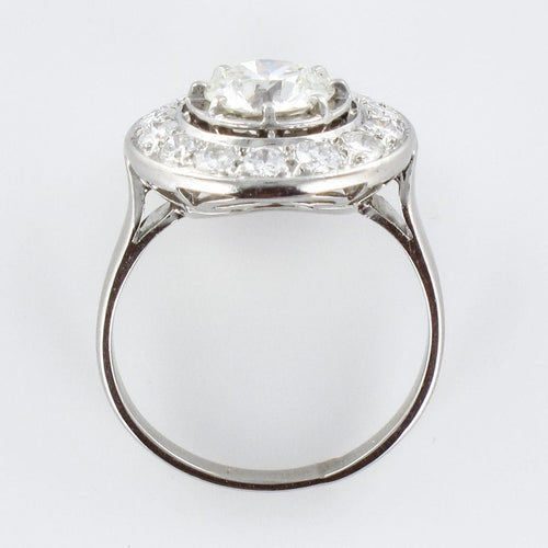 Ring in platinum, dog head hallmark. Round in shape, this sublime and timeless ring Art Deco is prong-set in the center of its setting with a brilliant-cut diamond, surrounded by 14 brilliant-cut diamonds. The basket is openwork to let the light penetrate under the gems.