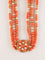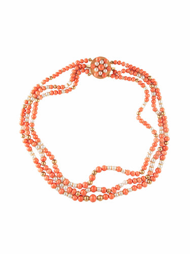 Three-row necklace made of coral beads, punctuated with gold beads and white beads. The clasp is in yellow gold. Manufactured at the beginning of the 20th century.