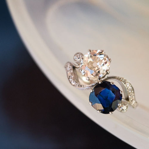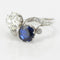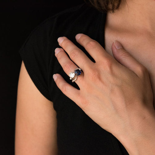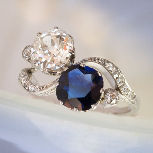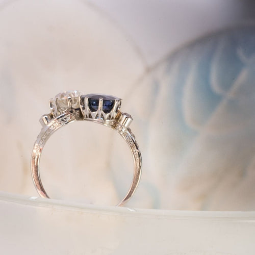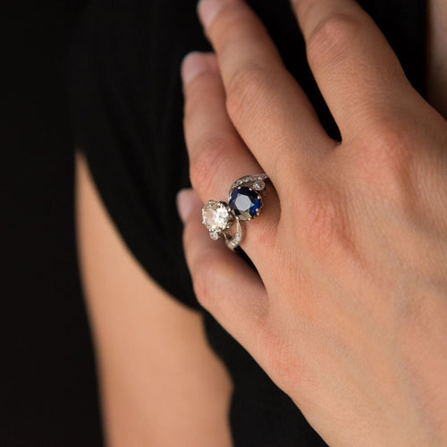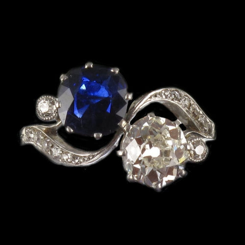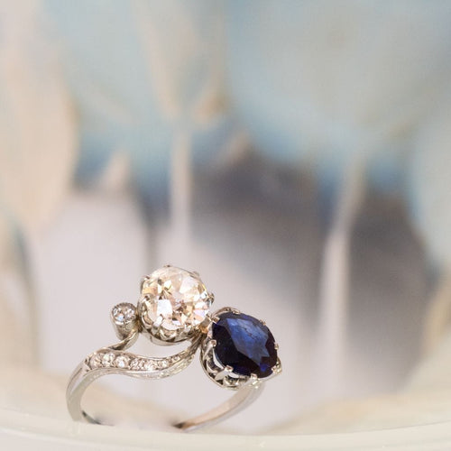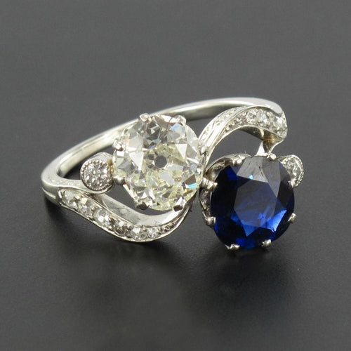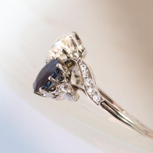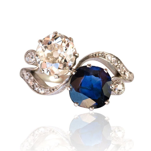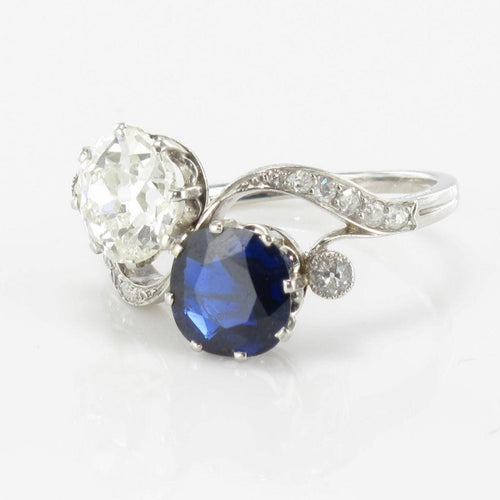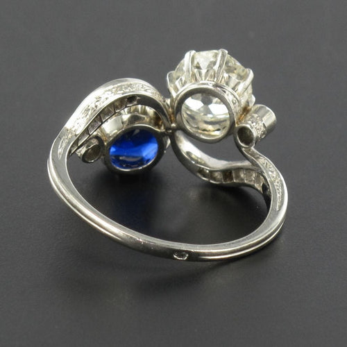 Ring Toi & Moi in 750/1000th white gold, 18 carats, eagle's head hallmark. This splendid old sapphire diamond ring is prong-set with a brilliant old-cut diamond and a round blue sapphire, all supported by two bezel-set diamonds. The top of the ring is animated, asymmetrical and set with two falls of 6 old-cut diamonds each. The profile of this sapphire diamond ring is chiseled on the upper part of a plant motif.