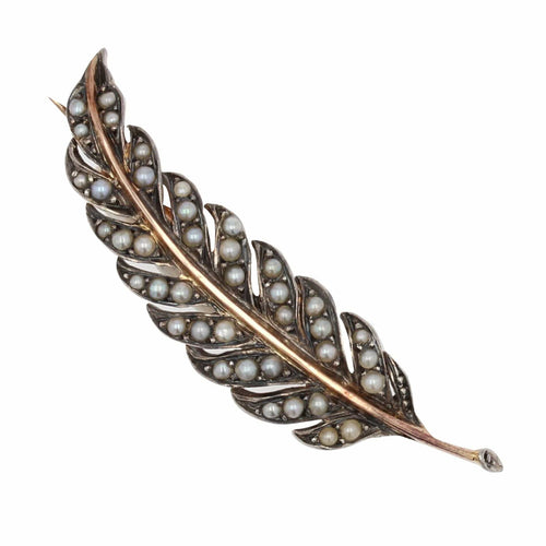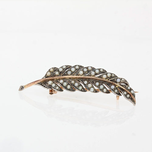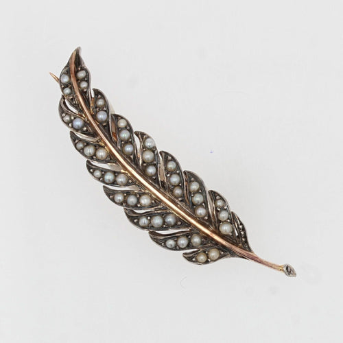 - Lovely old brooch, it represents a fern whose leaves are decorated with fine pearls. The attachment system is a pin with safety hook.